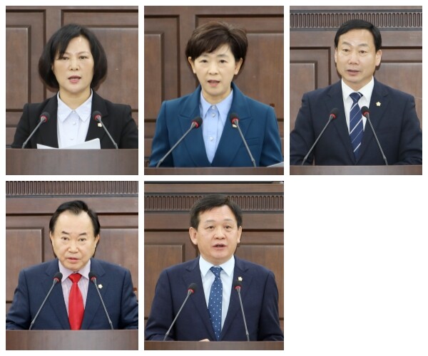 | ▲ (첫째줄 왼쪽부터) 조미정 의원, 이정미 의원, 송재천 의원, (둘째줄 왼쪽부터) 소재권 의원, 윤판오 의원. |