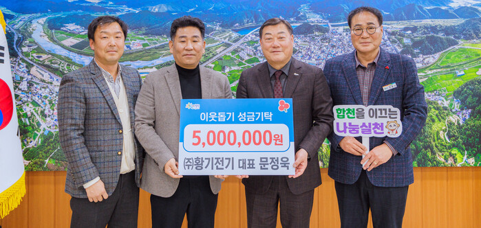 김윤철 합천군수는 “매번 성금을 기탁해 주시는 ㈜황기전기 문정욱 대표님께 진심으로 감사드리며, 전달해주신 성금은 따뜻한 손길이 필요한 이웃에게 잘 전달되도록 하겠다.”고 감사의 마음을 전했다.