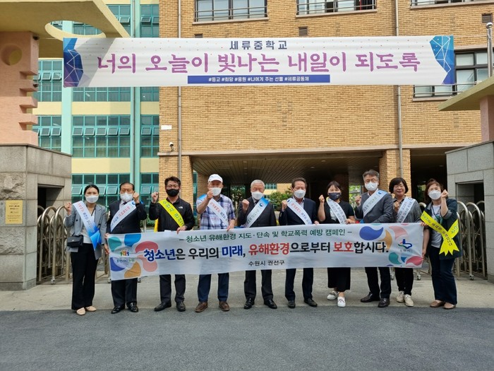 경기 수원시 권선구가 최근 세류역 및 권선구 지역내 세류중학교 등 4개 중·고등학교에서 하교 시간에 맞춰 ‘청소년 유해환경 지도·단속 및 학교폭력예방 캠페인’을 전개했다. 사진은 이날 캠페인 참가자들이 기념촬영을 하고 있는 모습. (사진제공=권선구청)