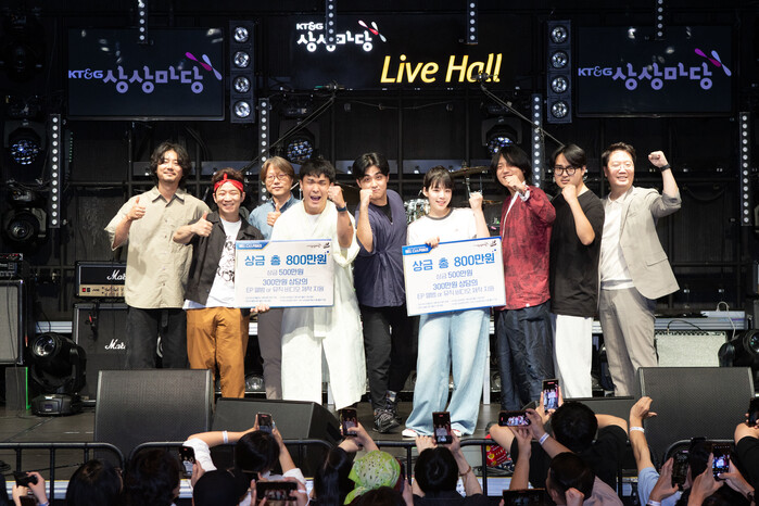 | ▲ KT&G(사장 방경만)가 잠재력 있는 인디 뮤지션들을 발굴 지원하는 ‘2024 밴드 디스커버리’ 최종 경연을 지난 25일 KT&G 상상마당 홍대에서 진행해 ‘윤마치(MRCH)’와 ‘품바21’ 2개팀을 우승팀으로 선정했다. 사진은 우승팀들이 시상식을 마치고 기념사진을 촬영하는 모습. (사진=KT&G 제공) |