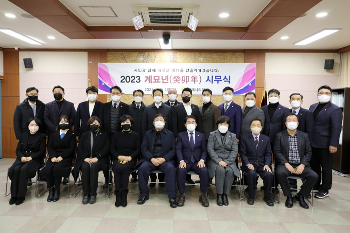 이날 시무식 에는 류명열 의장을 비롯한 시의원들과 의회 사무국 직원 등이 참석했으며, 국민 의례, 의원 윤리 강령 낭독, 의장 신년사 및 떡 케이크 커팅, 의원과 직원 간 신년 하례 순으로 진행됐다.