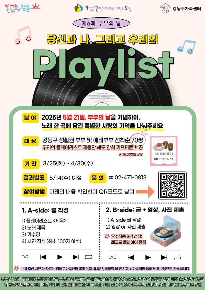 [시민일보 = 이대우 기자] 강동구(구청장 이수희)가 부부의 날(5월21일)을 기념해 오는 4월30일까지 ‘당신과 나, 그리고 우리의 플레이리스트’라는 주제로 부부의 추천곡을 공모한다.