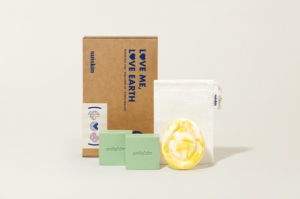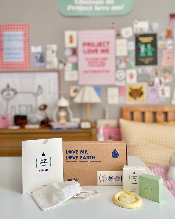20일 수이스킨에 따르면 이번에 출시되었던 친환경 콜라보 굿즈 기획세트는 수이스킨의 메인 제품인 비건 클렌징바 ‘맑은 아보밥 비누’와 미세플라스틱 없는 친환경 순면 거품망, 100% 폐플라스틱으로 만든 업사이클링 비누받침을 포함했다.