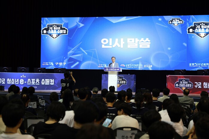 구로구가 최근 동양미래대학교 대강당에서 개최한 ‘구로구 청소년 e스포츠 슈퍼컵’이 청소년과 가족 1000여명이 참여한 가운데 성황리에 마무리됐다. 사진은 슈퍼컵에 참석한 장인홍 구청장이 인사말을 하는 모습. (사진=구로구청 제공)