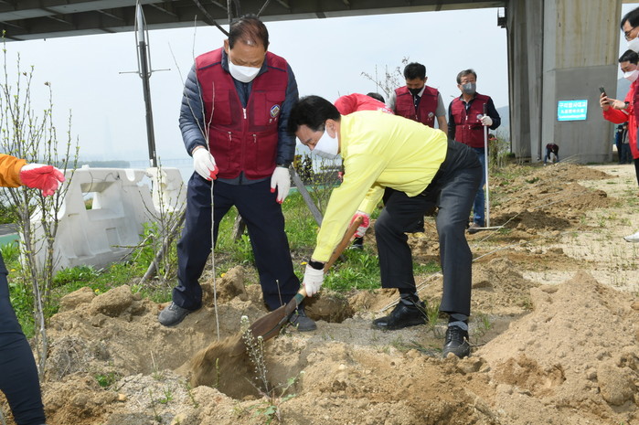 경기 구리시가 최근 민족통일 구리시협의회 주관으로 ‘무궁화 바로 알고 사랑하기’ 행사를 개최했다. 이날 회원들을 구리암사대교 하부에 무궁화 묘목 50주를 정성껏 식재하고, 구리역과 구리 전통시장에서 무궁화 150주를 시민들에게 배부했다. 사진은 이날 행사에 참여한 안승남 시장(오른쪽)이 무궁화를 식재하고 있는 모습. (사진제공=구리시청)