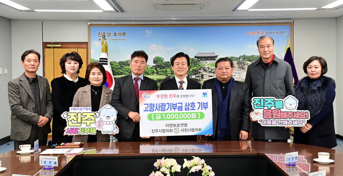 이날 기부는 회원들의 자발적인 참여로 진주시 자연보호협의회(회장 심명환)와 사천시 자연보호협의회(회장 박주태)는 고향사랑기부금 100만원을 상호 기부했다.
