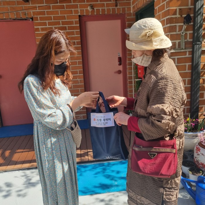 경기 동두천시는 치매환자가족 및 주보호자를 대상으로 ‘치매가족 힐링프로그램 휴드림 꾸러미 사업’을 운영하고 있다. 이번에 제공된 휴드림 꾸러미는 콩나물 키우기 세트로 직접 콩나물을 재배기에 심어 가정에서 원예 및 여가활동에 참여할 수 있도록 했다. 사진은 최근 시 관계자가 치매가족에게 휴드림 꾸러미를 전달하고 있는 모습. (사진제공=동두천시청)