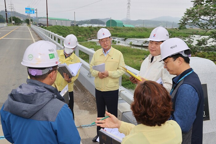 | ▲ 명현관 해남군수(가운데)가 대한민국 안전대전환 집중 안전점검기간을 맞이해 지난 1일 오후 3시경 삼산면 소재 어성교 교량 현장을 방문해 관계 공무원들로부터 시설 상황에 대한 보고를 받고 있다. / 해남군 제공 |