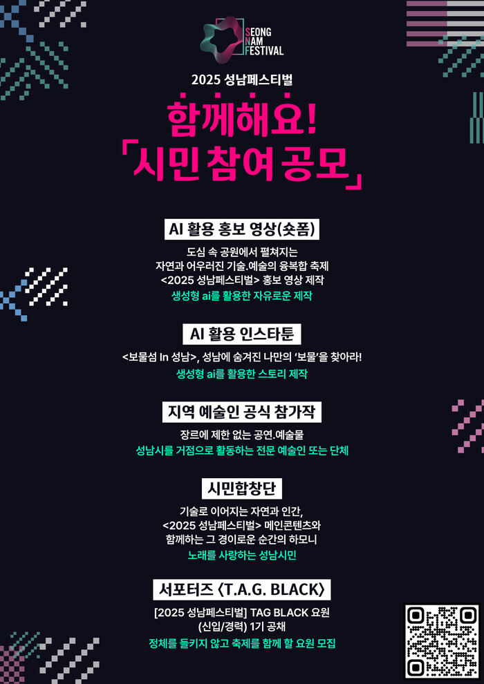 윤정국 성남문화재단 대표이사는 “이번 공모를 통해 더 많은 시민이 축제의 주체로 참여하길 바란다”며 “시민들의 감각과 창의성이 축제에 스며들어, 성남페스티벌이 일상과 예술이 이어지는 새로운 도시형 융복합축제의 모델로 발전하길 기대한다”고 밝혔다.