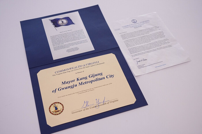 광주광역시(시장 강기정)는 최근 미국 버지니아주 글렌 영킨(Glenn Youngkin) 주지사가 친필 서명이 담긴 감사증서와 조셉 구스리 농업‧소비자서비스부 청장의 서한문, 버지니아주기를 보내왔다고 3일 밝혔다.