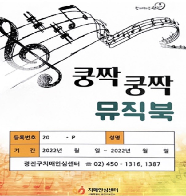 ‘쿵짝쿵짝 뮤직북’은 광진구 치매안심센터가 전국 최초로 음악을 활용한 가정 인지 학습지로 발간해, 치매 환자와 가족, 치매 관련 강사에게 큰 호응을 얻으며 전국 치매안심센터에서 활용할 수 있도록 공유한 바 있다.