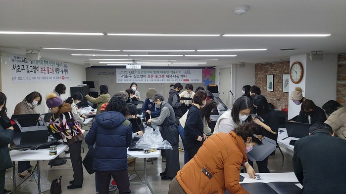 구는 지난 10일, ‘캣맘·캣대디’ 등 자원봉사자 50명들과 함께 서초구청 9층 교육장에서 얼지 않고 따뜻한 물을 오래 보관하는 외기차단용 박스와 보온물그릇을 조립·제작했다. 바깥의 찬바람이나 눈·비를 막는 외기차단용 박스 안에 보온물그릇을 놓는 형태다.