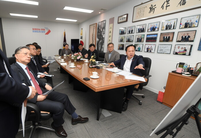 경기 오산시와 한국토지주택공사는 최근 신규 공급대상지로 선정된 세교3 공공주택지구의 효율적 도시개발을 위해 ‘오산 세교3지구 선정 관련 오산시-LH 현안 간담회’를 진행했다. 사진은 간담회에서 이권재 시장(오른쪽)이 발언을 하고 있는 모습. (사진=오산시청 제공)