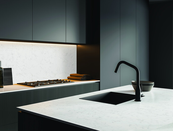| ▲ 1.주방 상판과 벽면에 '센스톤 쿼츠' 비너스를 시공한 이미지. (사진=KCC글라스 제공) |