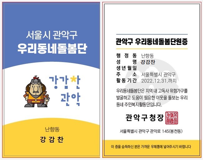 | ▲ 2022년 우리동네돌봄단 단원증. (사진=관악구청 제공) |