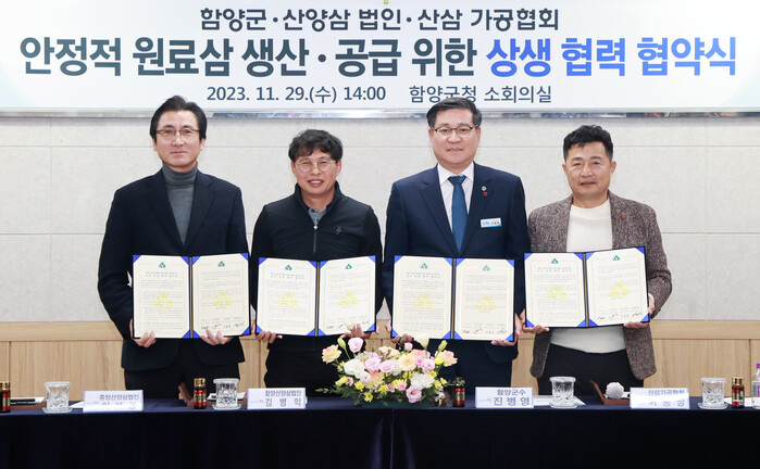 진병영 군수는 “이번 협약을 통해 원료삼의 원활한 생산·공급 체계가 구축되고 나아가 산양삼 산업의 발전에도 큰 역할을 담당할 수 있을 것”이라며 “함양군과 3개 법인이 협업하여 전국 산양삼 산업의 성공모델이 될 수 있기를 바란다”라고 밝혔다.
