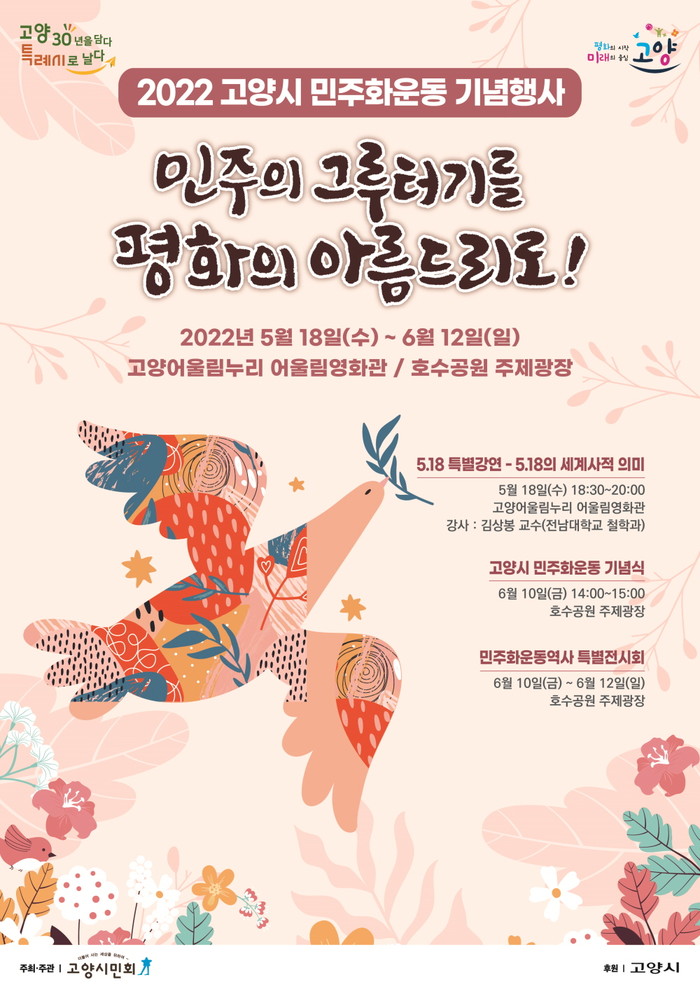 [고양=이기홍 기자] 고양시는 오는 5월 18일부터 6월 12일까지를 민주화운동 기념 기간으로 정하고 ‘민주의 그루터기를 평화의 아름드리로!’라는 슬로건 아래 4·19혁명, 5·18민주화운동, 6·10민주항쟁 등 우리나라 민주화운동 기념사업을 추진한다.