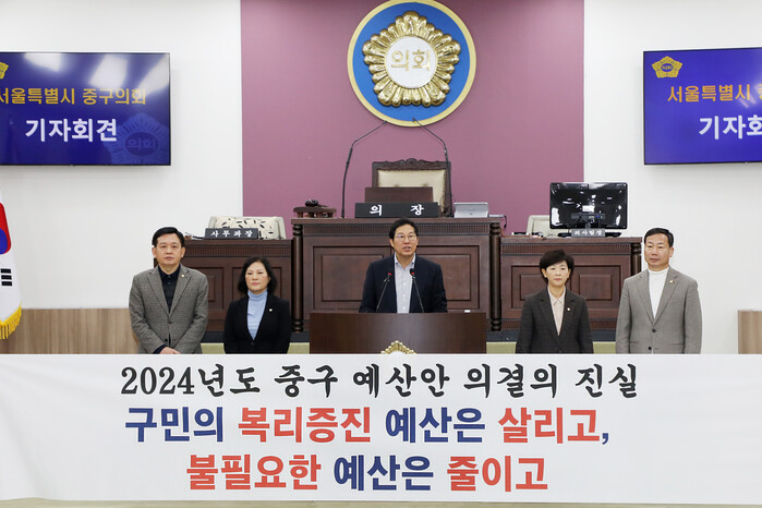 [시민일보 = 여영준 기자] 서울 중구의회 길기영·윤판오·이정미·송재천·조미정 의원이 지난 27일 의회 본회의장에서 2024년도 중구 예산안 의결 관련 기자회견을 열고 "불필요한 예산만 중점적으로 최소치로 삭감했다"고 밝혔다.