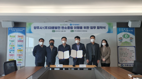 경기 양주시는 최근 (주)대륜발전과 함께 탄소중립 사회로의 성공적인 전환을 위한 업무협약을 체결했다. 각 협약 당사자는 탄소중립을 위한 국민적 합의와 공감대 확산에 상호 소통하고 지속가능한 발전과 탄소중립 실현을 위한 사업발굴·지원을 최우선으로 추진할 예정이다. 사진은 이날 협약식에서 관계자들이 기념촬영을 하는 모습. (사진제공=양주시청)