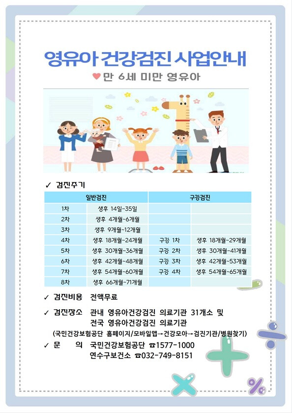 이재호 연수구청장은 “영유아의 건강한 성장 발달을 위해 정기적인 건강검진은 무엇보다 중요하다.”라며 “해당 시기에 맞춰 꼭 건강검진 받길 바란다.”라고 말했다.