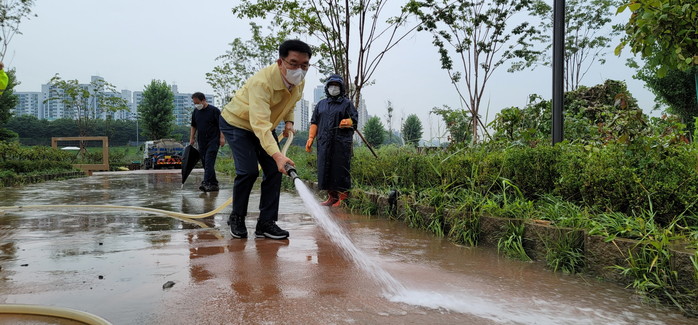 문헌일 서울 구로구청장이 지난 13일 수해복구 현장을 찾아 복구 활동에 나섰다. 문 구청장은 직접 잔해를 치우고 물청소를 하는 등 일손을 거들고 작업자들을 격려했다. 사진은 문 구청장이 안양천 수해복구작업에 참여해 물청소를 하고 있는 모습. (사진제공=구로구청)