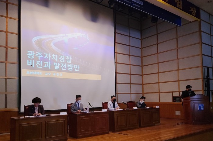 [광주=정찬남 기자] 광주광역시 자치경찰위원회는 21일 조선대학교 법과대학 내 모의법정에서 ‘광주자치경찰의 비전과 발전방안’ 세미나를 열고 토론을 펼쳤다.