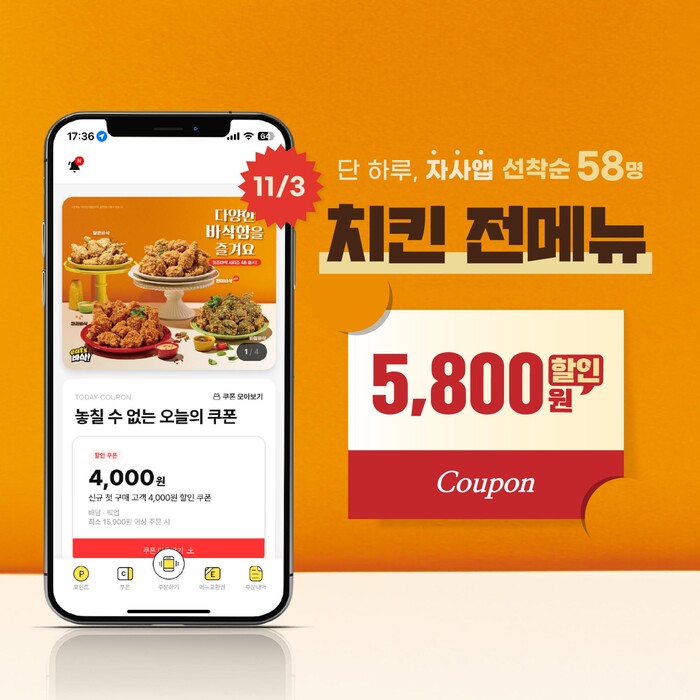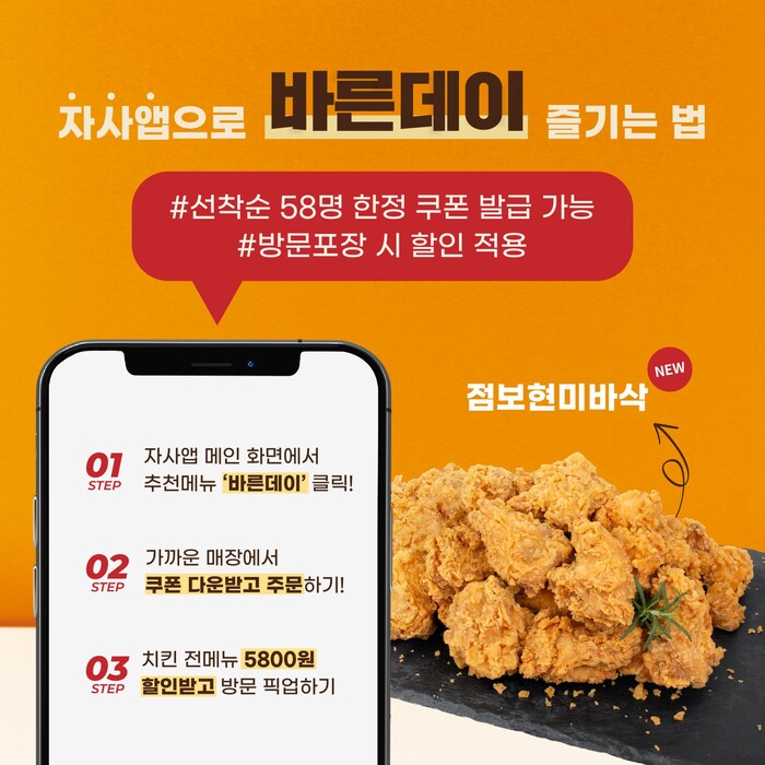 바른치킨 마케팅팀 관계자는 “이번 11월 첫번째 금요일부터 정기적으로 운영해온 바른데이 프로모션을 자사앱에서 진행하게 됐다”며 “각 매장당 선착순 58장의 할인쿠폰을 다운받을 수 있도록 하여, 고객분들이 앱을 통해 보다 쉽고 간편하게 할인을 받을 수 있도록 했다”고 말했다.