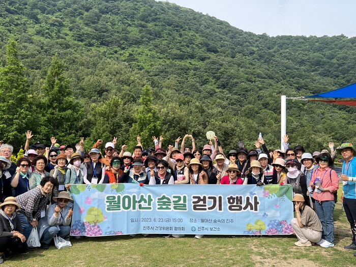 이날 행사는 월아산 숲속의 진주 야외주차장에서 몸풀기 체조로 시작해, 대나무숲길, 꾀꼬리숲, 참나무숲길, 자연휴양림 야외잔디마당 수국길을 거쳐 야외주차장에서 마무리하는 약 3km 코스로 진행됐다.