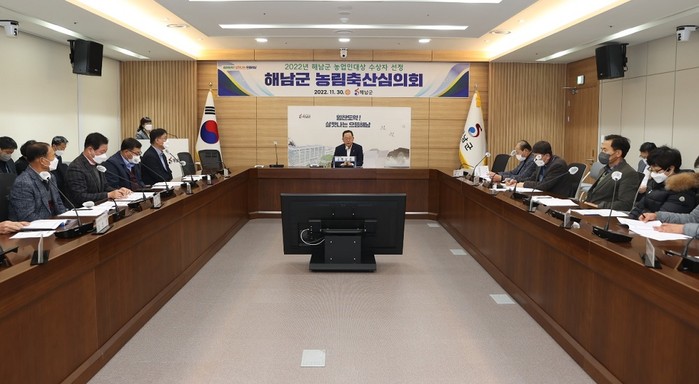 | ▲ 명현관 해남군수가 지난 11월30일 해남군청 대회의실에서 2022년 농업인대상 부문별 대상자 선정 농림축산 심의회를 주재하고 있다. / 사진=해남군 제공 |