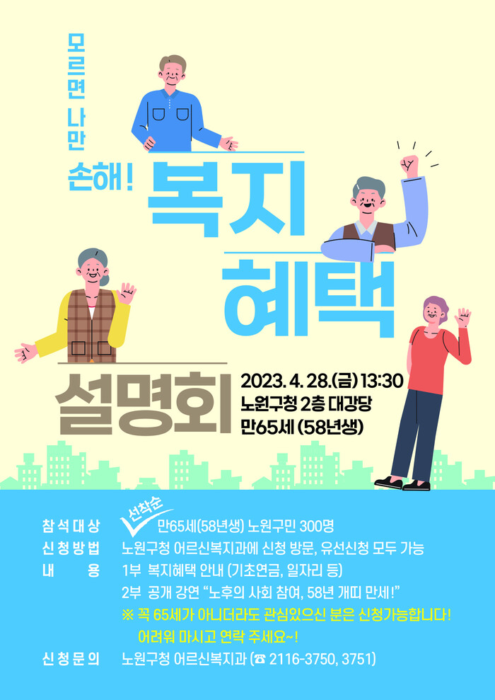 [시민일보 = 홍덕표 기자] 서울 노원구(구청장 오승록)가 오는 28일 구청 대강당에서 노인들을 위한 복지 혜택 설명회를 개최한다.