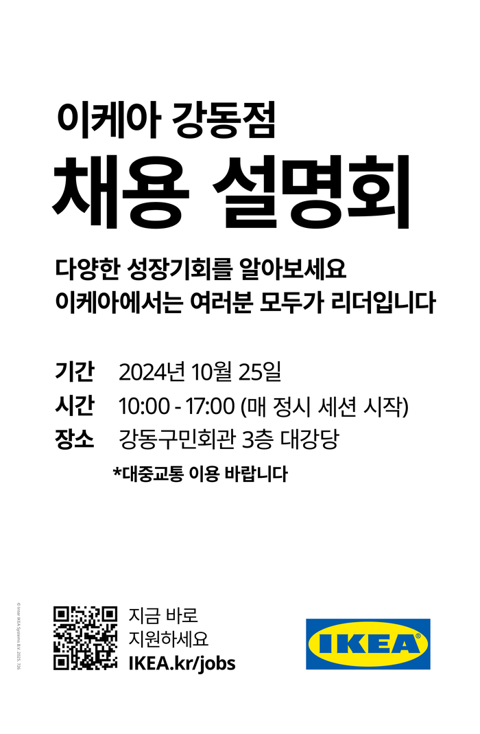 이번 채용설명회는 이케아 강동점에 관심 있는 누구나 별도의 사전 등록 없이 참석할 수 있으며, 이케아 강동점의 입사 지원은 10월 말부터 이케아 공식 채용 사이트를 통해 진행된다. 또한 채용설명회 현장에서도 온라인으로 지원서를 접수할 수 있고, 서류심사와 면접을 통해 선발된 최종 합격자는 2025년 1월부터 순차적으로 근무를 시작할 예정이다.