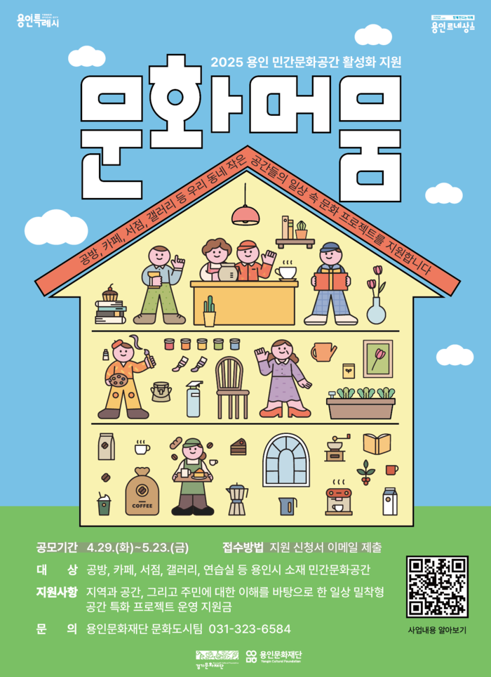 [용인=오왕석 기자] 용인문화재단(이사장 이상일)은 오는 5월 23일(금)까지 ‘2025 민간문화공간 활성화 지원사업 《문화머뭄》’에 참여할 공간을 모집한다.