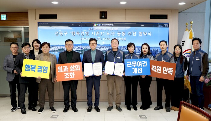 지난 11일 구는 이 같은 내용으로 전국공무원노동조합 서울지역본부 성동구지부와 함께 행복경영 시즌3 노사 공동 추진 협약을 체결했다.