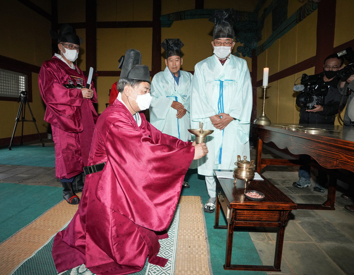 경기 광주시가 31일 광주향교와 숭렬전, 현절사에서 방세환 시장과 주임록 시의회 의장, 시의원들의 취임을 알리는 ‘고유례(告由禮)’를 봉행했다. 방 시장과 주 의장 및 시의원들은 이날 의식을 통해 새로운 소임을 성실히 수행하겠다는 약속을 성현들에게 고하며 시의 발전을 기원했다. 사진은 이날 방 시장이 고유례를 봉행하고 있는 모습. (사진제공=광주시청)