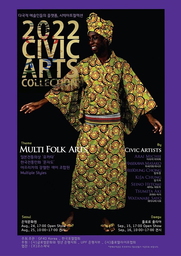 한국에서 활동하는 다국적 시민예술가들이 참여할 수 있는 플랫폼인 ‘2022 Civic Arts Collection’은 ‘Multi Folk Arts’를 테마로 한국전통 민화와 일본 민속의상 유카타, 그리고 아프리카의 강렬한 색을 조합한 멀티풀한 스타일링을 쇼와 전시를 선보이며, 오는 9월 15, 16일에는 대구 ‘플로르줄리아’에서 릴레이 행사를 개최한다.