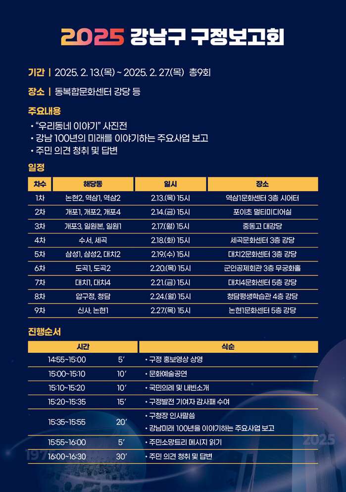 구정보고회는 강남구 22개 동을 2~3개씩 묶어 총 9차례에 걸쳐 진행된다.