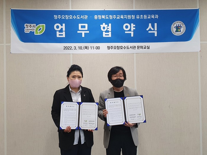 청주오창호수도서관(관장 이미영)이 10일 오창호수도서관 문화교실에서 충청북도청주교육지원청 유초등교육과(과장 백승운)와 유아· 초등의 독서문화 활성화와 독서교육을 위한 상호협력 협약을 체결했다.