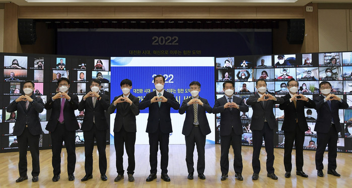 | ▲ 7일 오전 구청 6층 대강당에서 열린 2022년 신년인사회에서 문석진 구청장(왼쪽 다섯 번째)과 간부 직원들이 양손으로 하트 모양을 만들며 구민들에게 온라인으로 인사를 전하고 있다. (사진제공=서대문구청) |