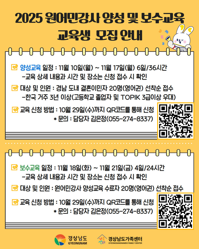 교육 신청은 도청 홈페이지 공지사항 또는 경상남도가족센터 홈페이지 프로그램 홍보 게시판에 게시된 QR코드를 통해 가능하며, 교육 신청 및 관련 문의는 경남도가족센터 총괄기획팀에서 담당한다.