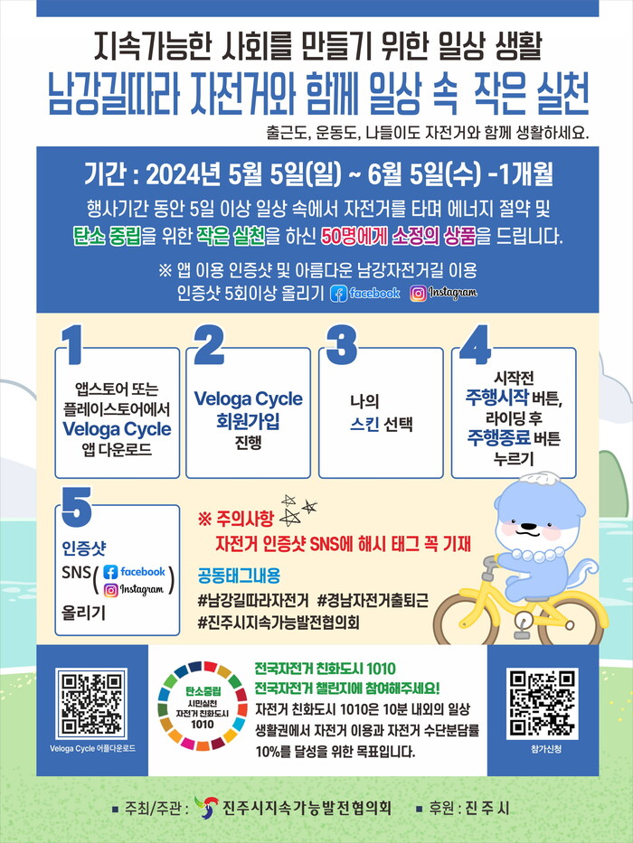 자전거를 이용하는 진주시민이면 누구나 참여할 수 있으며 스마트폰 앱에서 ‘벨로가사이클(VelogaCycle)’을 내려받아, 자전거를 탈 때 앱을 실행하면 된다. 5일 이상 해당 앱을 이용한 인증사진 또는 5회 이상 아름다운 남강 자전거 길 이용 인증사진을 3가지 해시태그(#남강길따라자전거 #경남자전거출퇴근 #진주시지속가능발전협의회)와 함께 SNS(페이스북,인스타)에 공유하는 시민 최대 50명에게는 소정의 상품을 제공할 계획이다.