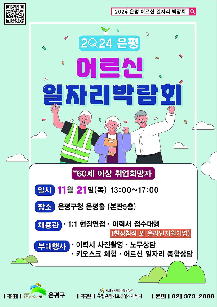 [시민일보 = 이대우 기자] 은평구(구청장 김미경)가 오는 21일 오후 1~5시 구청 5층 은평홀에서 ‘2024년 은평어르신일자리 박람회’를 개최한다.