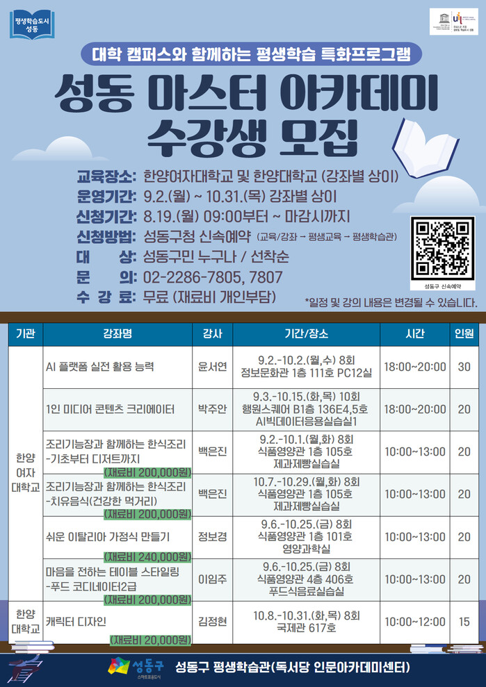 [시민일보 = 이대우 기자] 서울 성동구(구청장 정원오)는 성동구 평생학습관, 한양여자대학교 평생교육원, 한양대학교 미래인재교육원과 함께 주민들의 학습 수요를 반영한 ‘성동 마스터 아카데미’ 프로그램 수강생을 오는 8월 19일부터 선착순 모집한다.