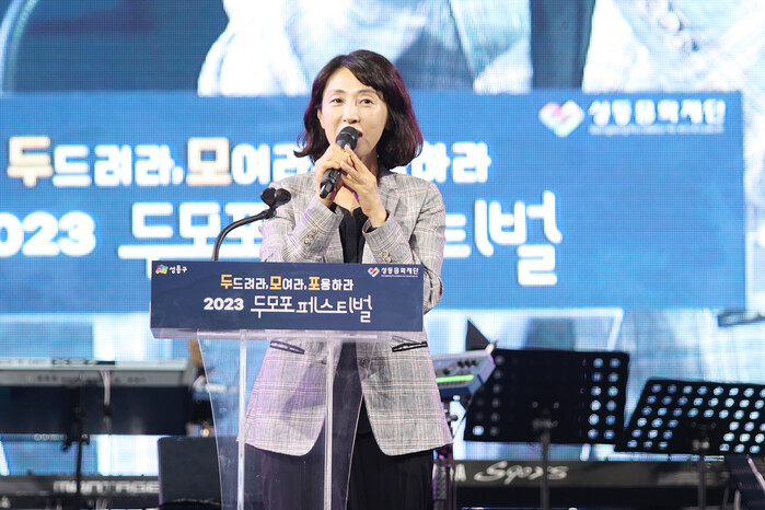 | ▲ 2023 두모포 페스티벌에 참석한 김현주 의장이 내빈들에게 인사말을 전하고 있다. (사진=성동구의회 제공) |