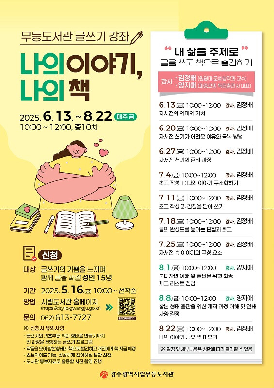 강좌 신청은 16일 오전 10시부터 광주시립도서관 누리집 ‘문화행사-문화강좌 신청’에서 하면 된다. 글쓰기에 관심 있는 시민이라면 누구나 신청할 수 있다. 모집 인원은 총 15명으로, 선착순 모집한다. 자세한 사항은 무등도서관으로 문의하면 된다.