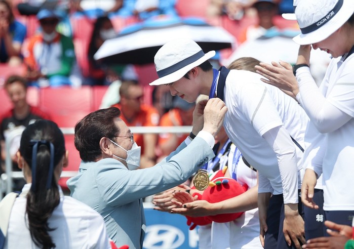 [광주=정찬남 기자] 이용섭 광주광역시장이 22일 오후 광산구 광주여자대학교에서 열린 광주 2022 양궁월드컵 대회 리커브 여자 단체전 결승에서 우승한 한국 대표팀 안산 선수에게 금메달을 걸어주고 있다./광주광역시 제공