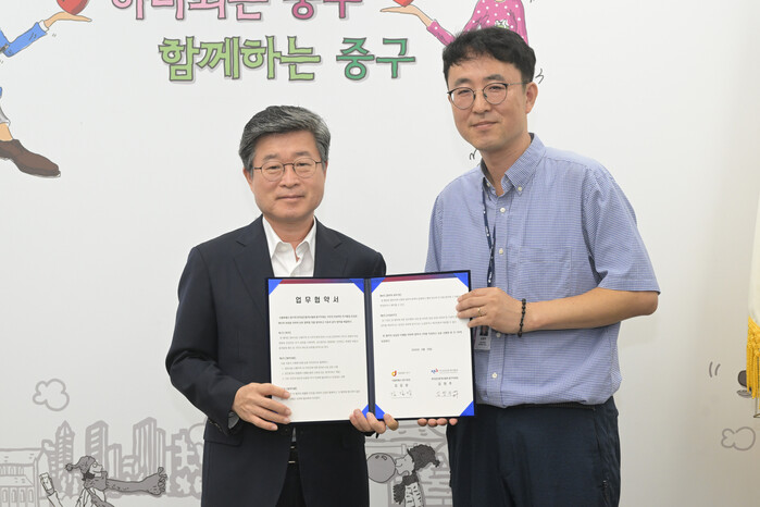 서울 중구와 한국공인중개사협회 중구지회가 최근 정비사업 시행지역 내 이주민 지원과 투명한 부동산 중개문화 조성을 위한 업무협약을 체결했다. 이번 협약에 따라, 중구지회는 정비사업 시행지역에 거주 주민이 매매 또는 전·월세 임대차 계약을 체결할 경우 중개수수료를 20% 감면해 주기로 했다. 사진은 김길성 구청장(왼쪽)과 김정주 중구지회장이 기념촬영을 하고 있는 모습. (사진=중구청 제공)