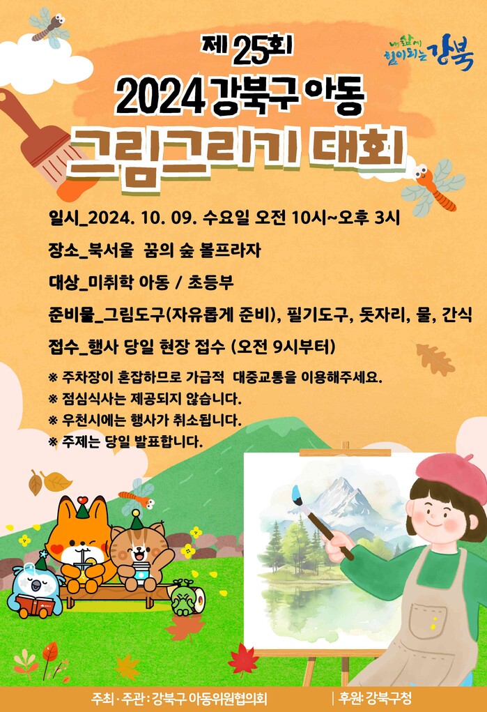 [시민일보 = 문민호 기자] 서울 강북구(구청장 이순희)는 오는 9일 오전 10시부터 북서울꿈의숲 내 볼프라자에서 ‘제25회 강북구 아동 그림그리기 대회’를 개최한다.