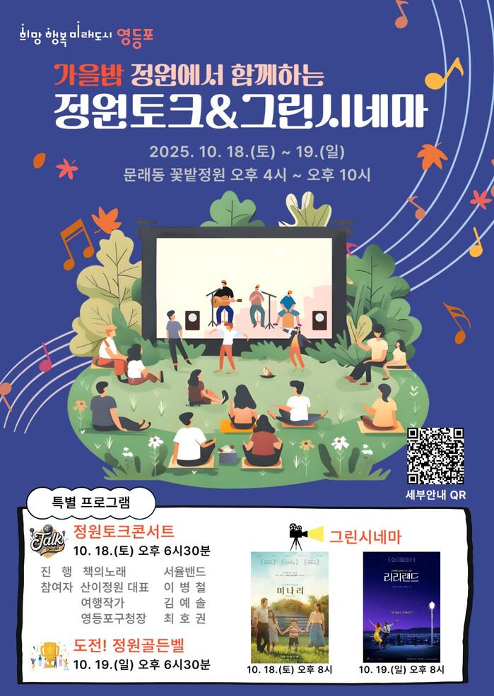 [시민일보 = 여영준 기자] 영등포구(구청장 최호권)는 오는 18~19일 양일간 문래동 꽃밭정원에서 ‘정원토크콘서트 & 그린시네마’를 개최한다고 밝혔다.