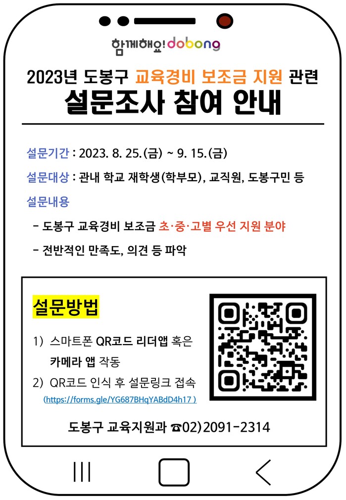 온라인으로 진행되는 본 설문조사는 도봉구 교육경비 보조사업 지원 방향 및 의견 청취를 목적으로 초·중·고별 우선 지원 분야, 만족도, 제안 등을 조사한다.