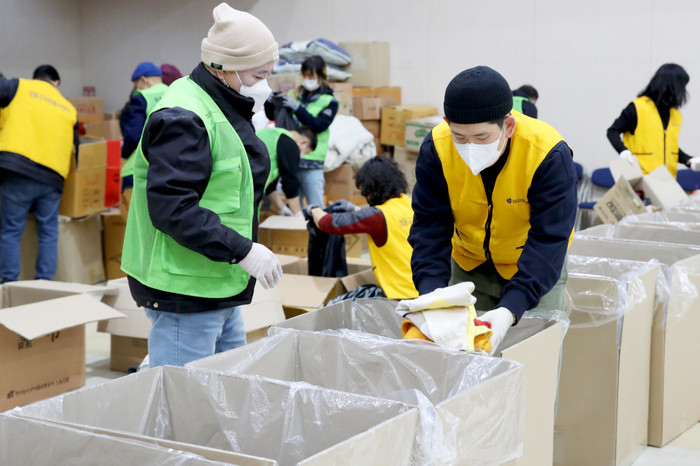 | ▲ 성동구 자원봉사자들이 접수된 구호물품을 검수하여 분류하고 있다. (사진=성동구청 제공) |